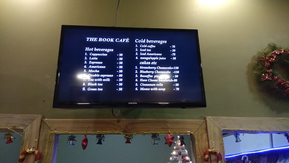 For food, the menu offers a range of light bites and desserts including strawberry cheesecake, blueberry cheesecake, banoffee pie, ham cheese sandwich, cinnamon rolls, and momo served with soup. These items provide suitable options for light meals alongside beverages.